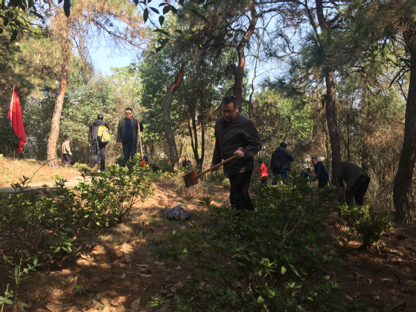 上午10时许,只见一行人手执“后勤服务中心”旗帜,肩扛铁锹,快步赶到了凌家山东峰的劳动现场。这里红枫成片、桂花成行、山杉成片、修竹成行,自然生长的各种树木布满山坡,呈现出春天迷人的景象。会员们顾不得赏景,一头扎进树林,热情高涨,干劲十足,轻车熟路地将一株株杜鹃树苗仔细地栽种好。不一会儿,50余棵杜鹃苗木全部按照植树技术规范栽植成功。