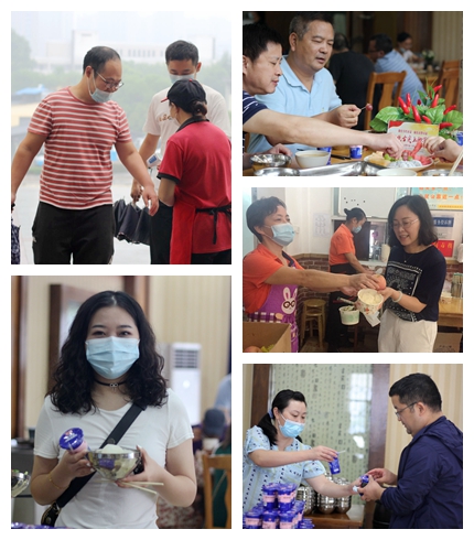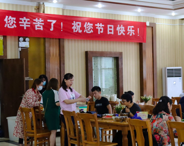 “酸酸甜甜营养奶,诚心实意真心话——您辛苦了,节日快乐!” 9月10日中午,学校东二食堂二楼教工餐厅,整洁明亮的餐桌上摆放着一张张“拒绝舌尖上的浪费”厉行节约宣传卡,一束束色彩鲜艳的桌花,一盘盘新鲜可口的水果拼盘,一份份琳琅满目的美食,如农家三鲜、爆炒杏鲍菇、红烧全鱼、红烧排骨、素炒莴笋丝、银耳汤水、酸奶......浓郁的节日气氛感染了每一位前来就餐的教职工。在学苑餐厅内,主管邹国祥、服务员陈纯等人亲手将“幸福果”赠送到每一位就餐的教师手上,暖心地说:“节日快乐,幸福平安!”