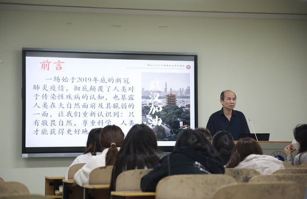 讲座邀请了校医院主任医师沈泓海作专题报告。他重点讲述了传染病的基本概念、传染病的分类、传染病防治的基本原则三个环节,介绍了新冠病毒的基本知识。通过剖析典型案例,沈泓海向现场学生强调了大学生在疫情期间应尽的责任和义务。随后,沈泓海详细讲解了“大学生健康应知应会”,帮助学生了解各种常见健康问题及解决措施,身体不适应当如何选择医院,如何高效、精准的与医生交流等一些生活必备的技能。