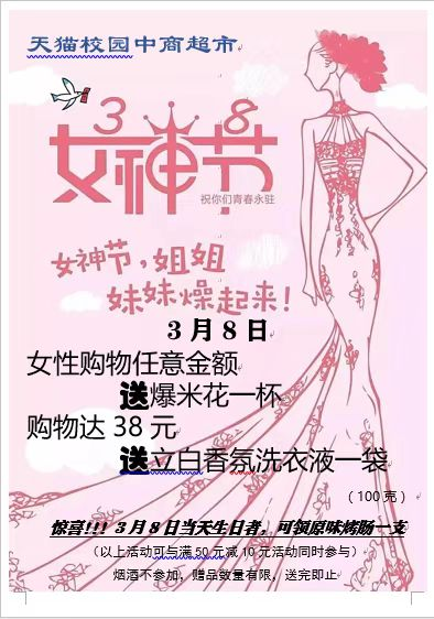 (通讯员 周惠兰)阳春三月,生机盎然。为庆祝“三八”国际妇女节,让全校女教职工度过一个温馨愉快的节日,3月8日,后勤保障处商贸管理办公室联合中商超市,在东、西区超市举行了“三八女神节”系列优惠活动。