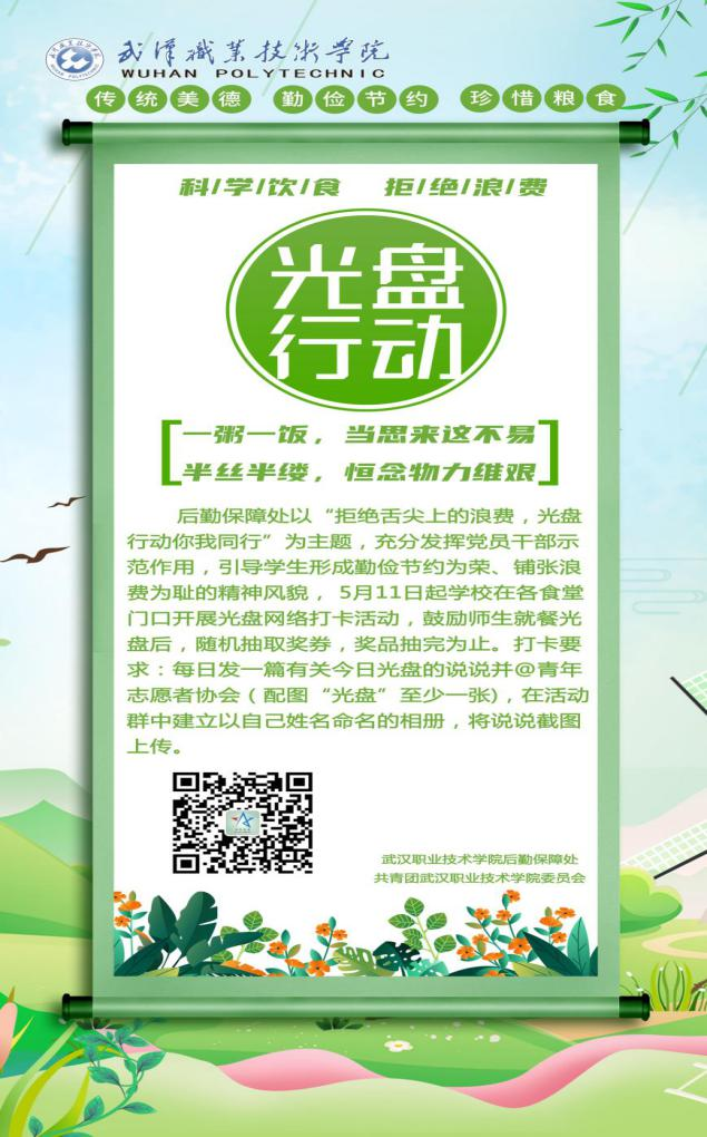(通讯员 卢惠玲)为了响应国家治理粮食浪费的倡议,倡导可持续的绿色餐饮理念,后勤保障处、校团委共同组织与发起在学校食堂举办“光盘行动”的系列活动。