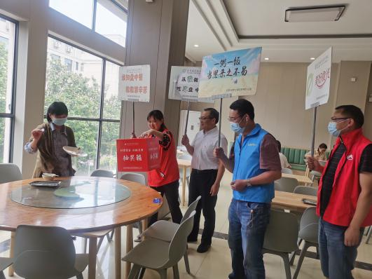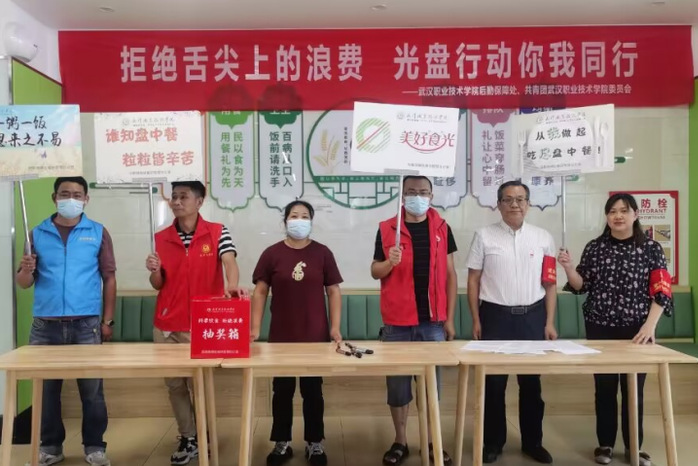 下沉到活动现场的党员干部手举“谁知盘中餐 粒粒皆辛苦”“美好食光”“提倡节约 反对浪费”宣传牌,列队行进在二楼的二个就餐大厅之中,一边高呼“光盘行动”口号,一边向同学们宣讲“光盘行动”的意义,一边解答活动流程,一边兑现次品。许多同学拍照留影。