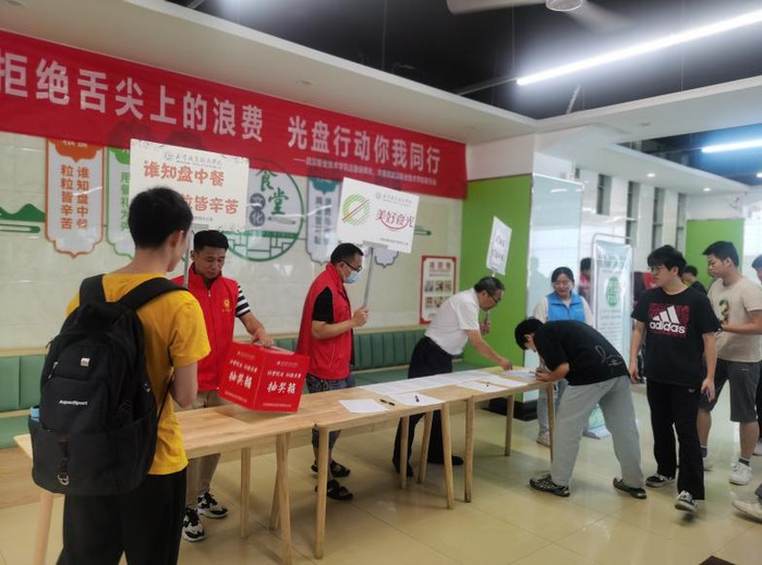 中餐时分,师生们来到活动现场。工作人员热情地向他们打招呼,提示活动流程。同学们积极响应,纷纷拿出手机扫码、关注、签名、登记、抽奖,脸上露出喜悦的笑容。有许多同学就餐后举着“光盘”向我们展示,场面十分感人。